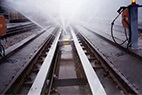 高速動車組列車在高速行駛中帶起的雪花結(jié)成了冰,附著在列車地盤上,這些冰層會影響機(jī)械師對列車地盤的檢查,對行車安全帶來隱患。因此在檢修前,機(jī)械師們先要把列車地盤和輪軸上的冰清除干凈。這些冰大多聚集在地盤零件的空隙里,凍的非常結(jié)實(shí),要想把它們處理干凈,傳統(tǒng)的方法是用特制的工具,一點(diǎn)點(diǎn)往下鏟。為此,北京德高潔清潔設(shè)備有限公司組織技術(shù)力量,研發(fā)了一款全自動高速動車組列車底盤、輪軸除冰系統(tǒng)。